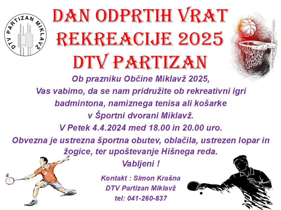 Ob prazniku Občine Miklavž 2025, Vas vabimo, da se nam pridružite ob rekreativni igri badmintona, namiznega tenisa ali košarke v Športni dvorani Miklavž. V Petek 4.4.2024 med 18.00 in 20.00 uro. Obvezna je ustrezna športna obutev, oblačila, ustrezen lopar in žogice, ter upoštevanje hišnega reda. Vabljeni !